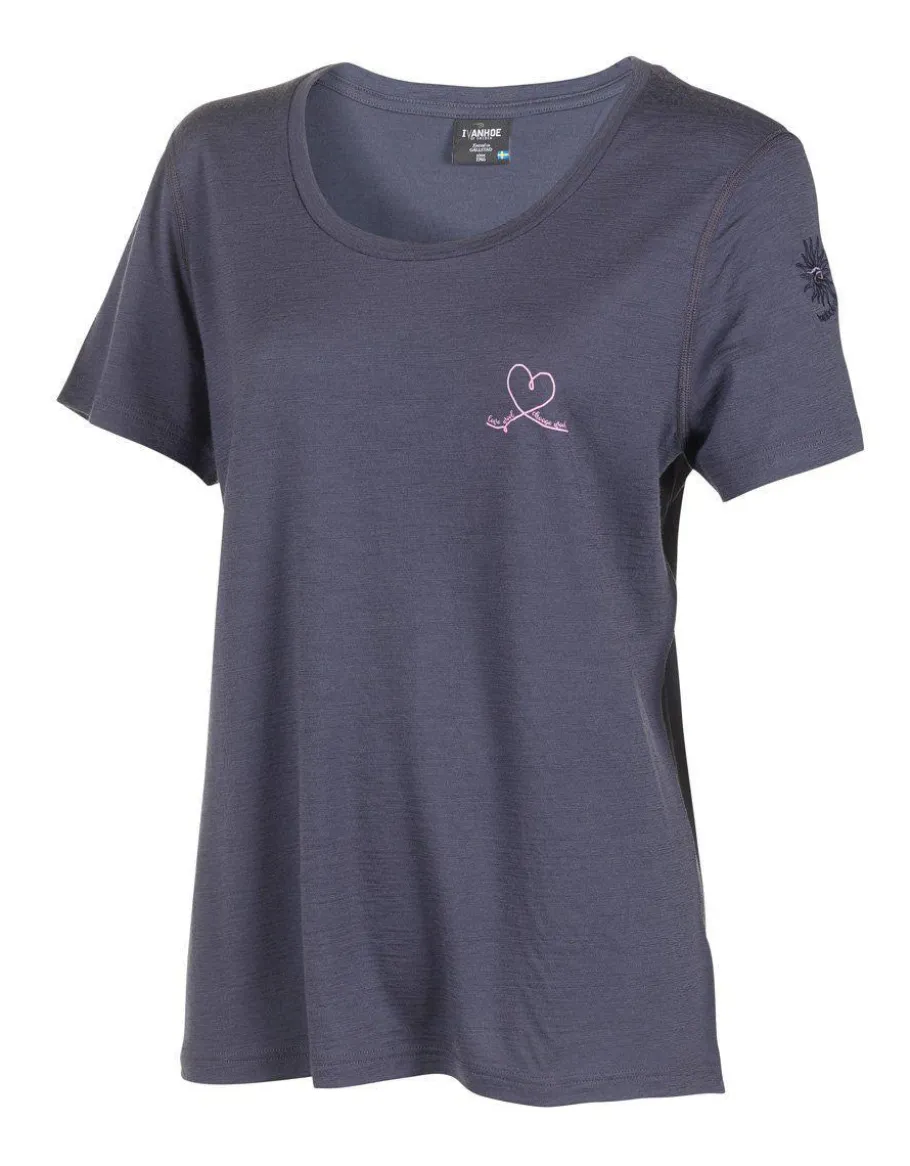 UW Meja heart är en rundhalsade topp i 100% merinoull, extrafine, här med ett lite mindre tryck på vänster bröst. Trycket, som är ett smakfullt garnhjärtat, har samma rosa ton på alla 4 varianter. Otroligt användbar för alla tillfällen.