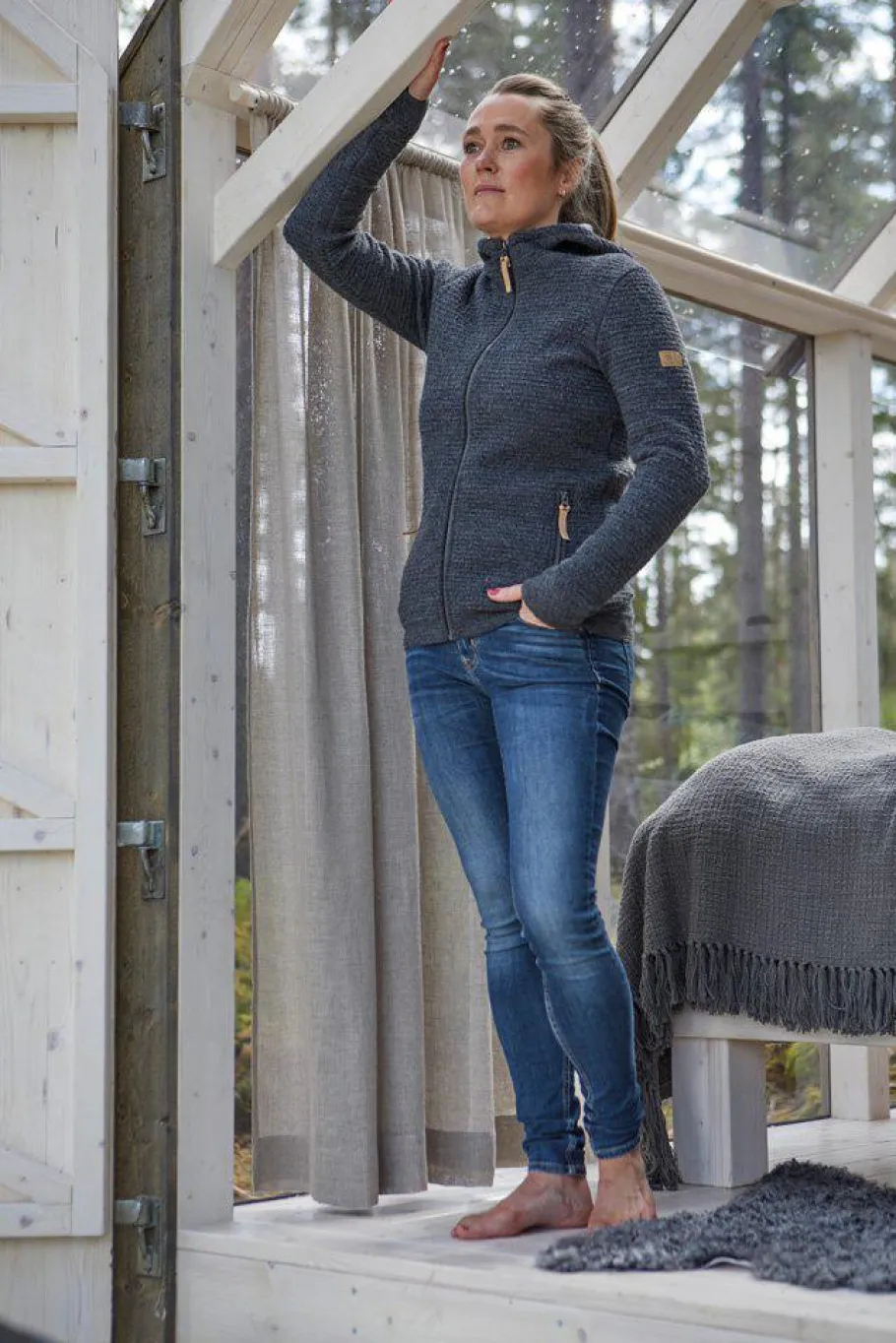 Morel Hood female är en fantastisk ulltröja med luva och hel dragkedja framtill samt dragkedja i sidfickor. Plagget är sticket i en helt nyutvecklad 3D-stickning där stickade luftfickor både ger design och funktion. Materialet är en mix av ull och TENCEL® där ullen ligger som yttersta lager och TENCEL® in mot kroppen. Den avvikande färgen på TENCEL®-garnet ger en schyst designeffekt. Nertill i ärmavslut och body återfinns en ribbstickad mudd. Logomärke i jacron är placerat upptill på vänster ärm.
