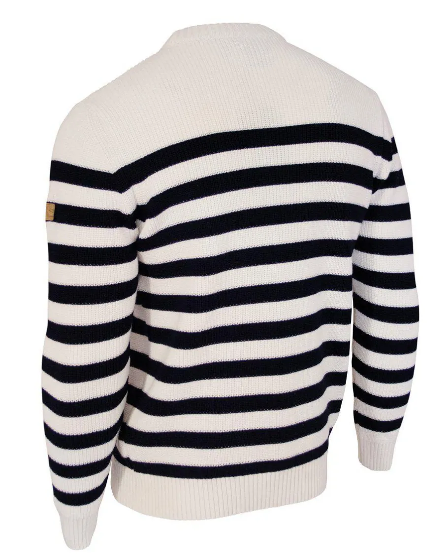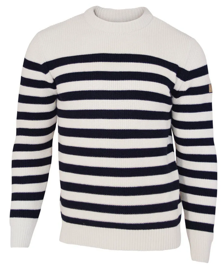 Rundhalsad tröja med en klassisk, tidlös rand. Ribbstickad mudd nertill i ärm och body samt ribbstickad krage. Litet enfärgat ok upptill ger extra designeffekt. Logomärket jacron sitter nertill på vänster ärm. En riktigt härlig sommarfräsch tröja med marint tema.