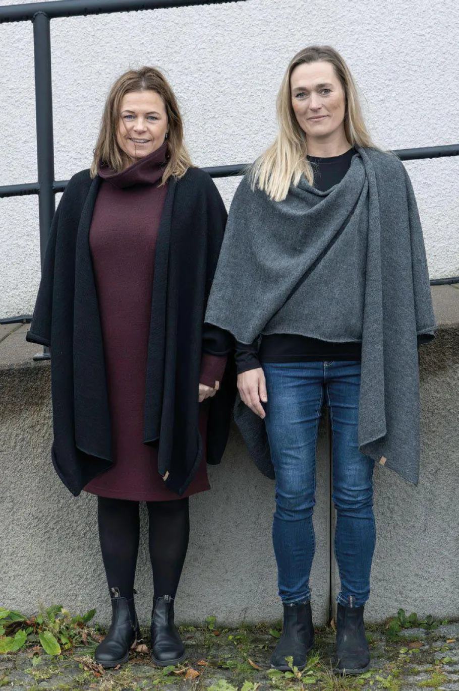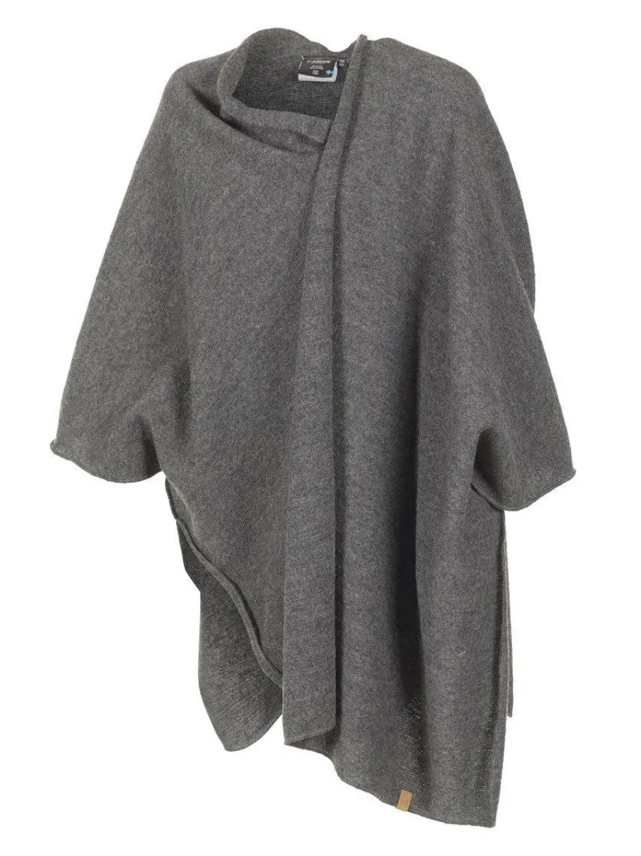 Poncho, eller poncho-väst som går att variera och bära på olika sätt, allt efter humör och känsla. Lätt att slänga på sig och värmer skönt. Stickad i 100% ull och vår lätta 3-trådsfilt, så väger inte mycket utan är oerhört skön att bära. Säljs i one size.
