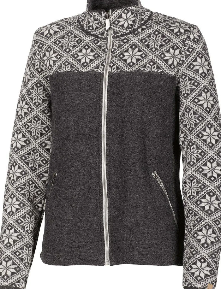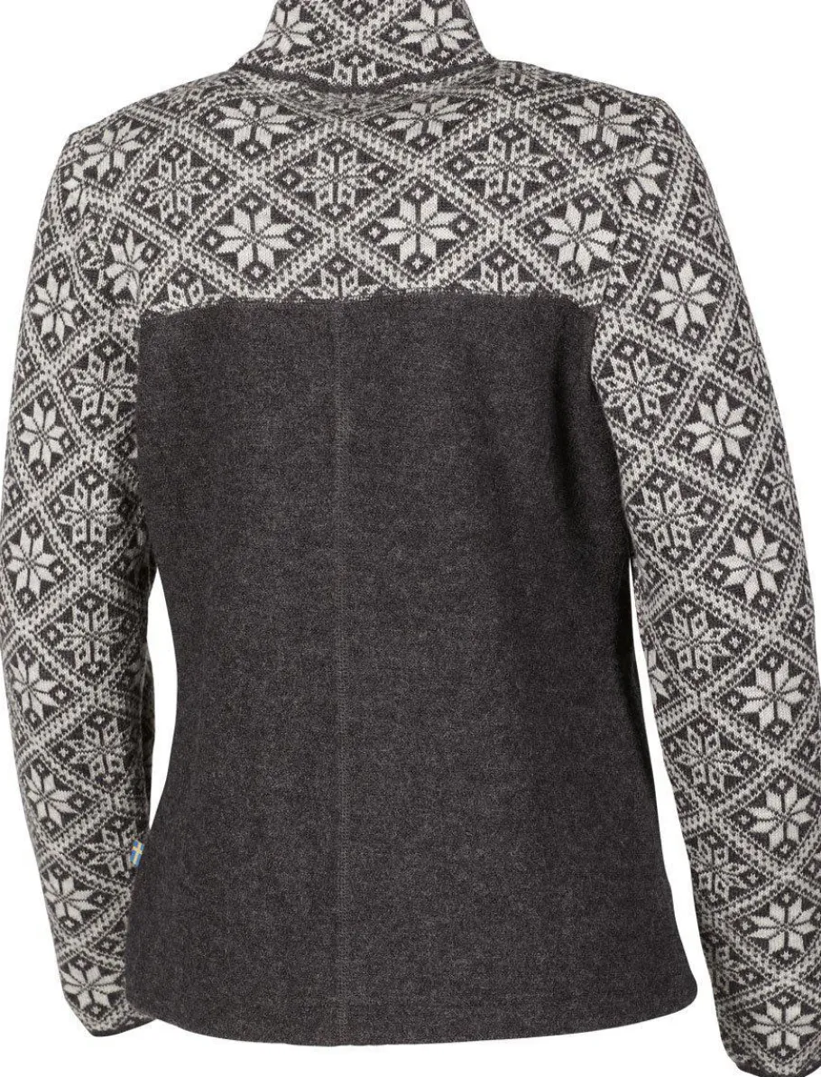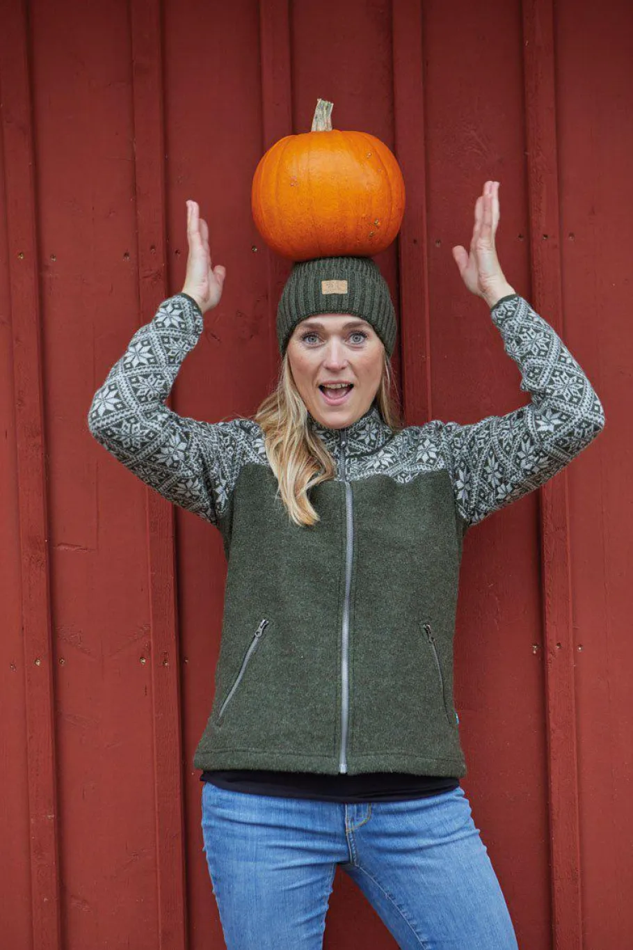 En fantastisk ulljacka/kofta i där valt att mixa vår så unika filtade ullkvalitet med ett vackert, mönsterstickat jaquardmönster med ett typiskt Skandinaviskt uttryck. Hel dragkedja framtill, samt dragkedjor i sidfickorna. Ett litet logo-märke sitter placerat nertill på vänster ärm. Perfekta tröjan för den som gillar att vara aktiv. Tröjan är stickad hos oss i Gällstad, Sverige. En väldigt omtyckt tröja.