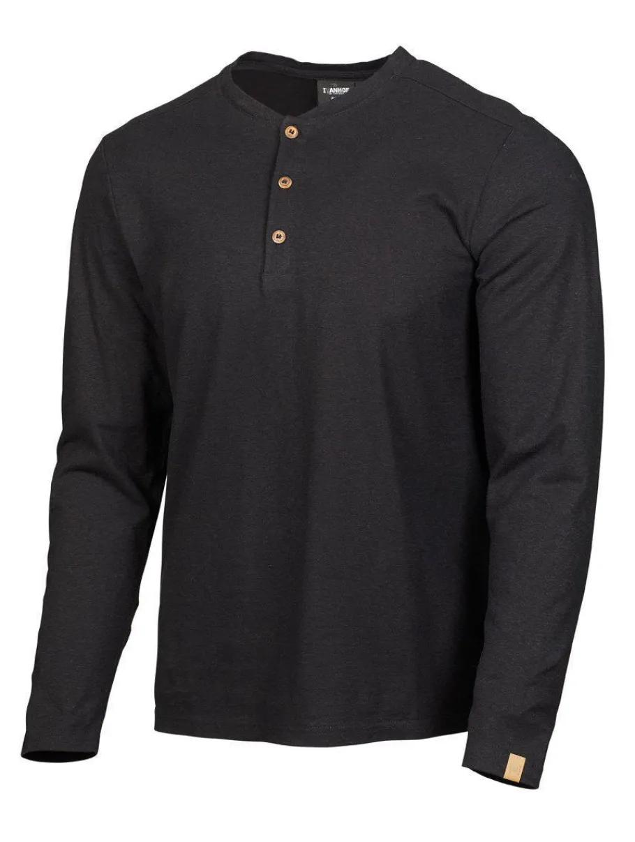 Långärmd T-shirt i en härlig mix av ekologisk bomull och hampa. Materialat har en schyst slubbeffekt som ger extra effekt. Tre träknappar framtill samt litet logomärke i jacron nertill på vänster ärm.