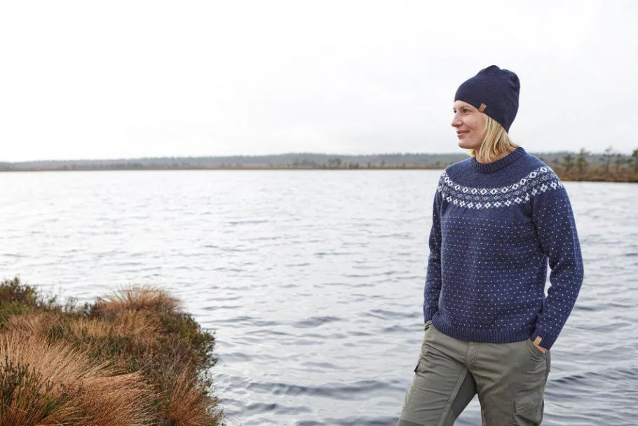 Sire crewneck är en vacker, folkloreinspirerad rundhalsad tröja stickad i 100% ull. Halskanten är ribbstickad och nertill i ärm och body har vi också valt att avsluta med en ribbstickad mudd. Hela mönsterbilden går såklart runt hela plagget. Nertill i vänster ärmavslut sitter ett logo-märke tillverkat av Jacron. En mysig tröja som passar både till vardags som när man är aktiv.