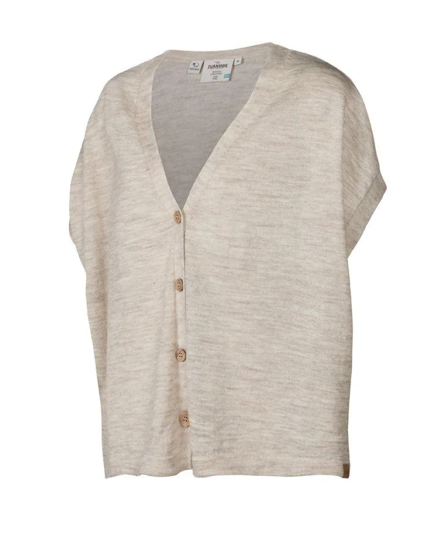 Finstickad poncho med knäppning. Ullen är helt obehandlad och utan tillsatser av både kemikalier och färgämnen – en helt ny nivå av hållbarhet! Lättburen och matchar med det mesta. Smidig och enkel att slänga med i väskan och skön att värma axelarna med en kall sommarkväll. Knapparna är tillverkade av kokosnötskal och varje knapp är unik och har både egen struktur och färg.