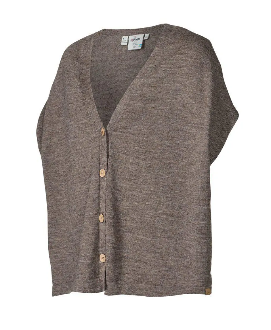 Finstickad poncho med knäppning. Ullen är helt obehandlad och utan tillsatser av både kemikalier och färgämnen – en helt ny nivå av hållbarhet! Lättburen och matchar med det mesta. Smidig och enkel att slänga med i väskan och skön att värma axelarna med en kall sommarkväll. Knapparna är tillverkade av kokosnötskal och varje knapp är unik och har både egen struktur och färg.